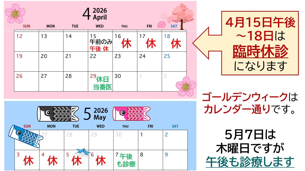2026.03.05 4月15日(水)午後・16日(木)~18日(知土)は臨時休診とさせていただきます。5月7日は木曜日ですが、午後の診療を行います。下のカレンダーもご参照ください。